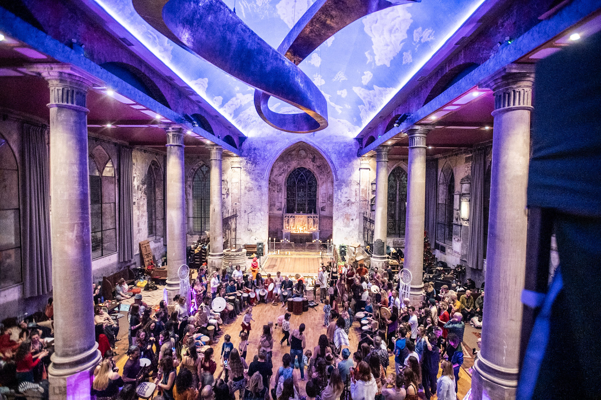 A 900-year-old church reborn as one of the most awe-inspiring venues. Professional sprung wood floor and underfloor heating. A cathedral of light, sound and transformation, The Mount Without is the heart of our ritual.