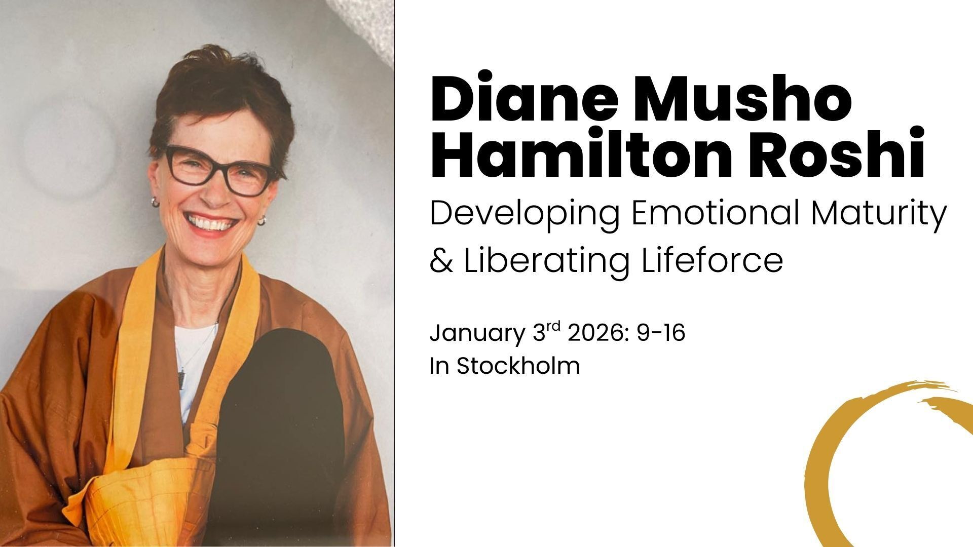 Diane Musho Hamilton Roshi will visit Stockholm to offer a full-day workshop on developing emotional maturity. This workshop is an opportunity to learn how to better navigate emotional states by feeling them more fully and letting them go more easily when they no longer serve us.