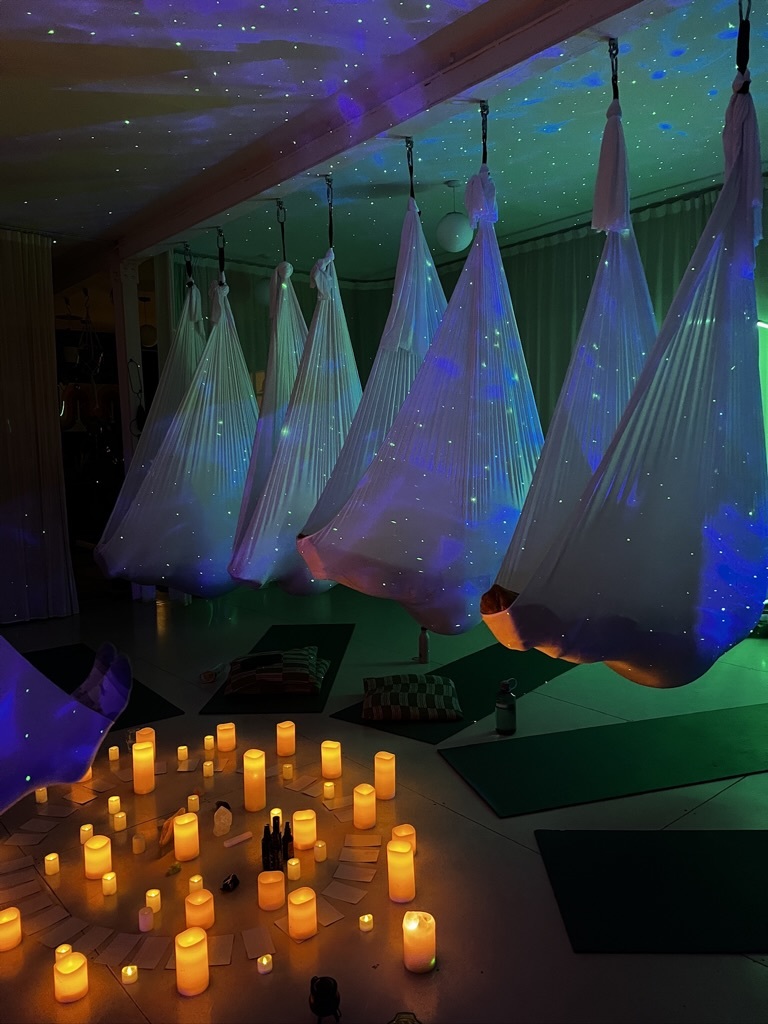 Once your body has settled, you’ll drift into one of our hammock relaxation pods and be immersed in quadraphonic winter soundscapes, think The Snowman, crackling hearths, soft winds through pines, distant bells, and shimmering chimes, composed to invite deep stillness and wonder. If the sky is clear, you can stargaze through the skylight above as you rest by candlelight.